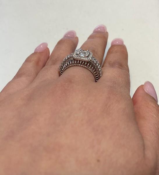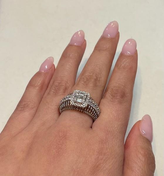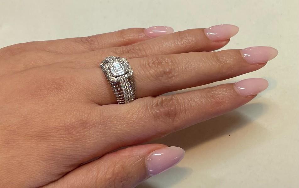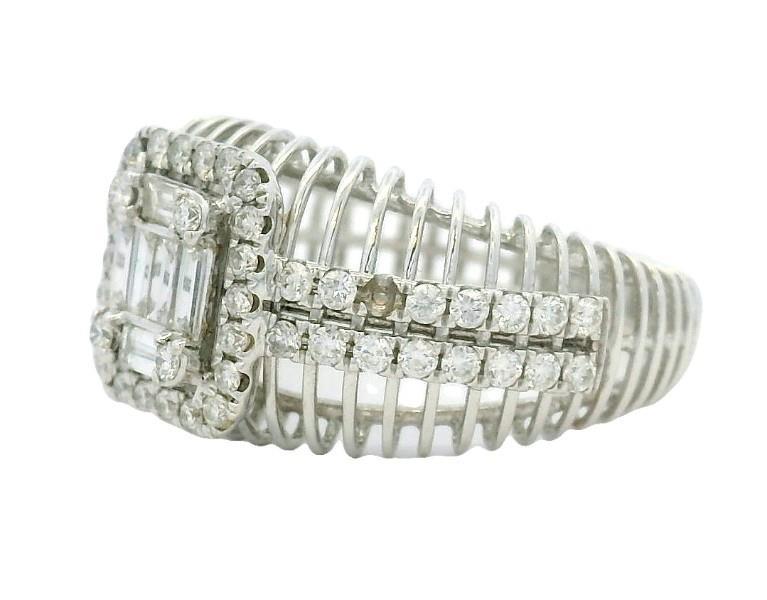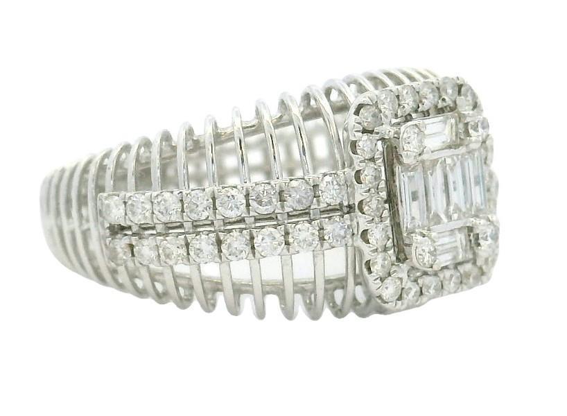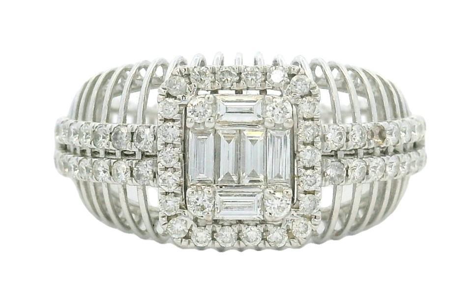 18ct white gold featuring six baguette cut Diamonds and four round brilliant cut Diamonds, illusion set in the centre forming an emerald shape, surround by a halo of smaller round brilliant cut Diamonds, extending across the shoulders in two rows, claw set, joined to a skeleton wire band with slight taper, merged into a polished strip at the back. A.T.D.W.: 0.730ct. Ring size: L1/2. Total Weight: 3.9g