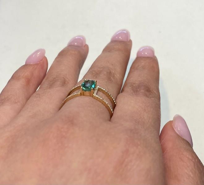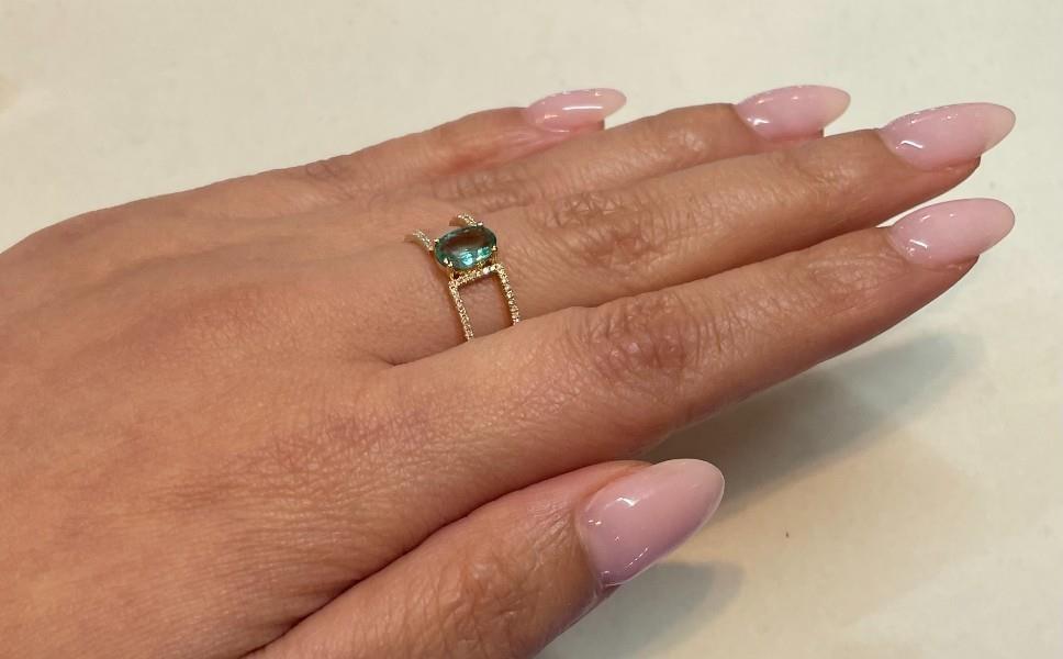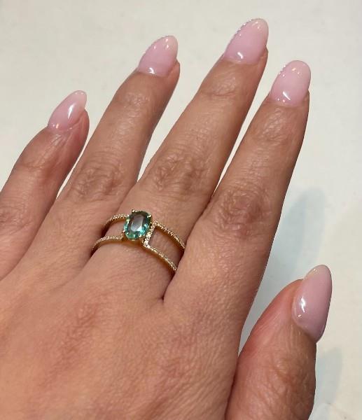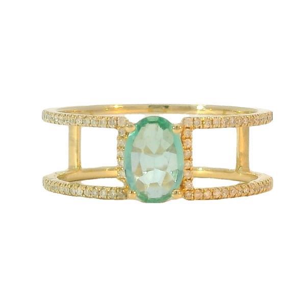 14ct white gold, of modern design, featuring a centre oval cut Zambian Emerald, totalling 0.52ct, claw set, light blue green, set against an open frame ring, lined with round brilliant cut Diamonds to the front, totalling 0.13ct, met with polished square edge frame at reverse with connecting bars. Ring size: O. Valuation on request. Total weight: 2.2g
