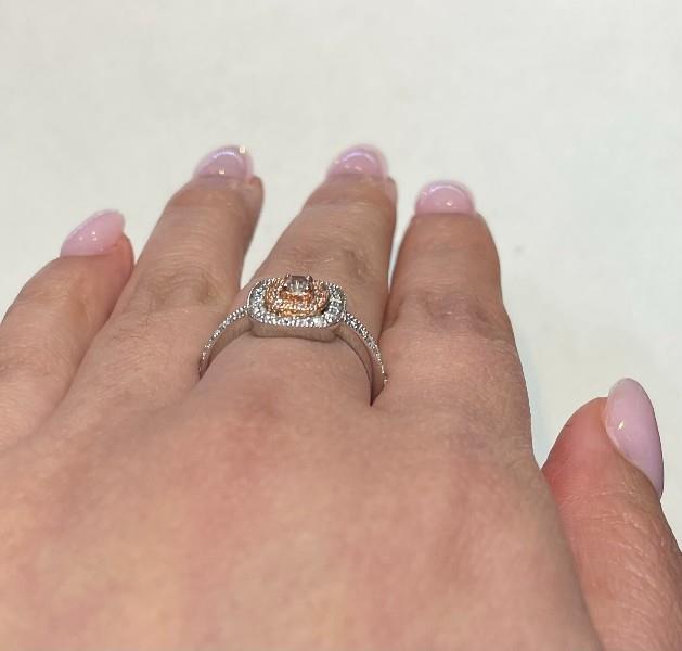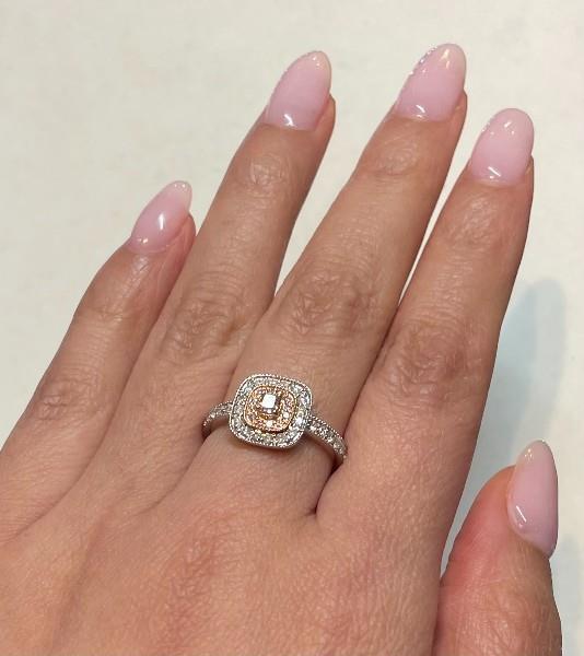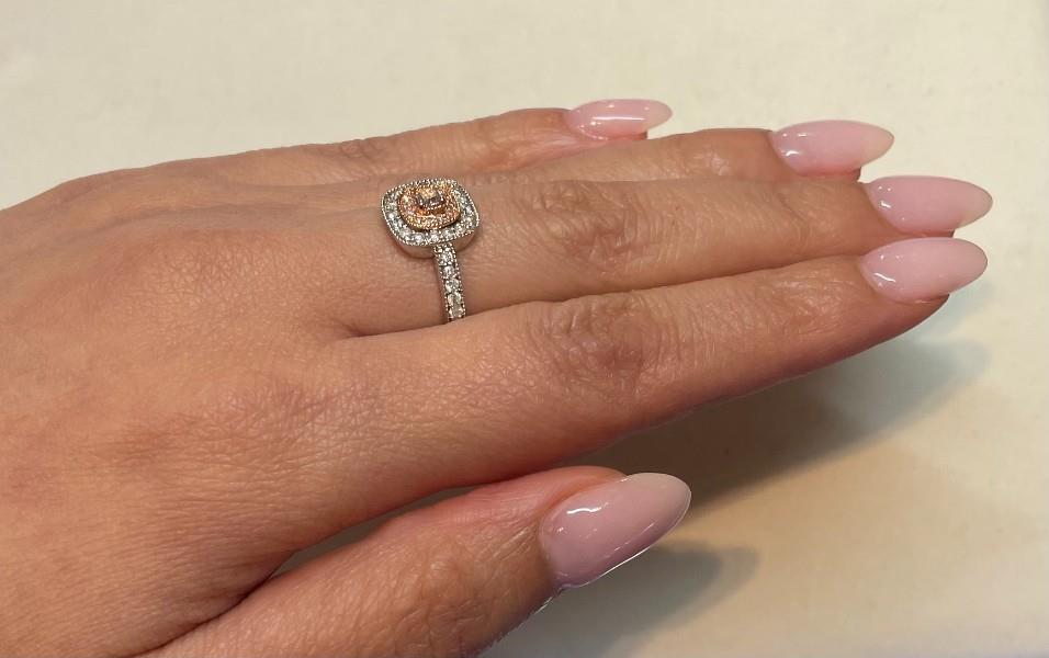 14ct white and rose gold, featuring a cushion cut pink Diamond, totalling 0.12ct, claw set, medium dusty pink tone, surrounded by a recessed halo of twelve smaller light pink round brilliant cut Diamonds, totalling 0.20ct, claw set, further surrounded by a recessed halo of round brilliant cut Diamonds, totalling 0.30ct, extending to the shoulders, claw set, millgrain finishes throughout, merging into a square band. A.T.D.W.: 0.70ct. Ring size: M. Valuation on request. Total weight: 2.7g