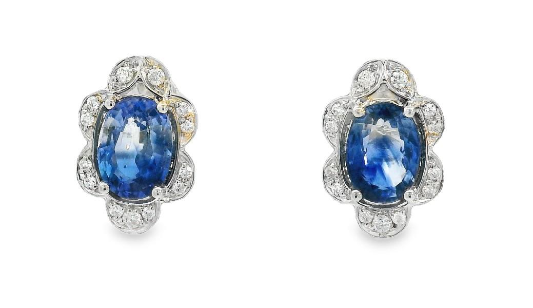 A PAIR OF 14K W.G OVAL CUT SAPPHIRES (2.06CT) & DIAMOND (.13CT) FLORAL CLUSTER STUDS, T.W.: 2.4GRAMS