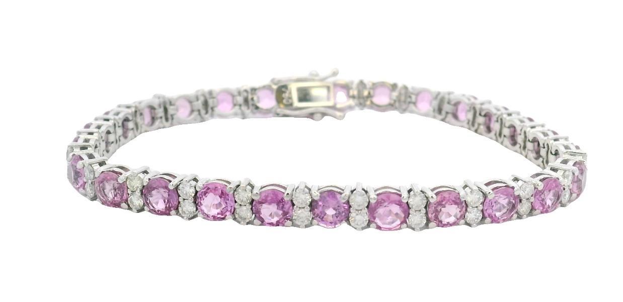 18ct white gold, featuring twenty-seven round cut Sapphires, totalling 13.40ct, medium pink colour, claw set, open backs, alternating between vertical lines, set with two round brilliant cut Diamonds, totalling fifty all together with a combined weight of 2.05ct, claw set, individual basket setting, linked through the base in a semi-flexible bracelet measuring 17cm in length, complete with concealed box clasp, and secure with double side latches. Valuation on request. Total weight: 15.4g