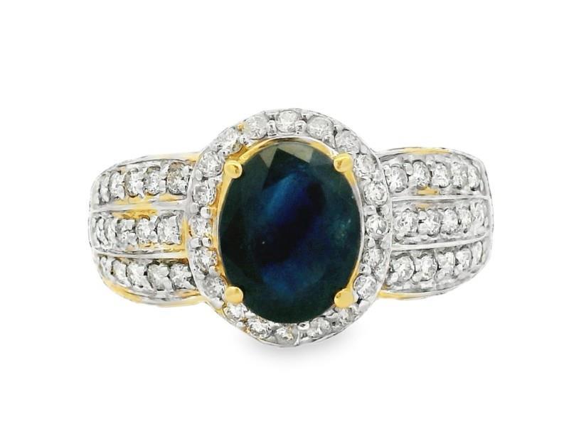 14ct yellow gold, featuring an oval cut Sapphire, totalling 2.34ct, raised, claw set, surrounded by a halo of round brilliant cut Diamonds, extending to triple rows of Diamonds, making up the width of the shoulders, claw set with white gold, triple grooves separating the rows, merging into a tapered band at reverse. A.T.D.W.: 0.52ct. Ring size: P1/2. Valuation on request. Total weight: 3.9g