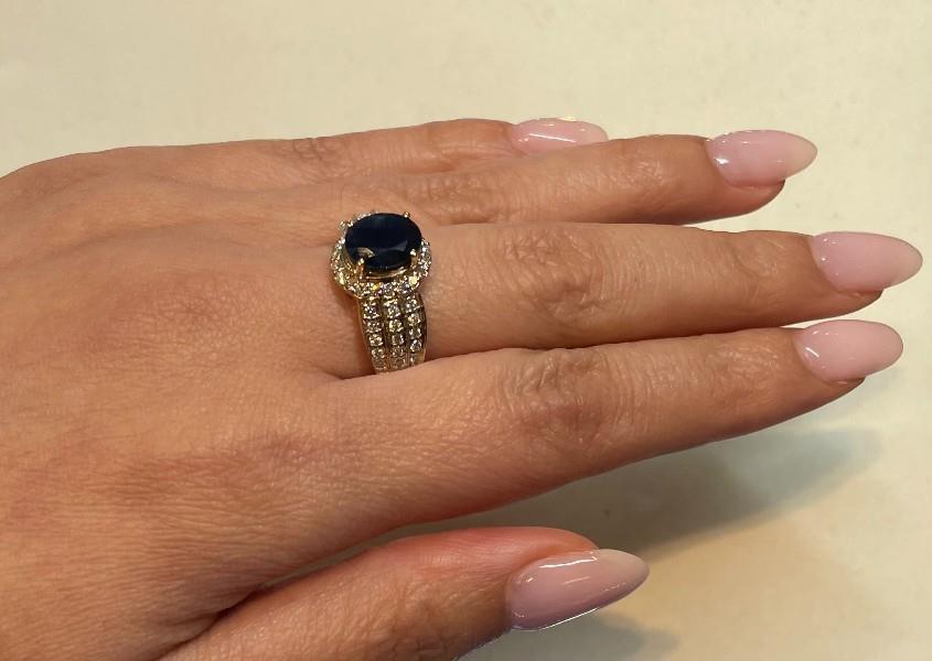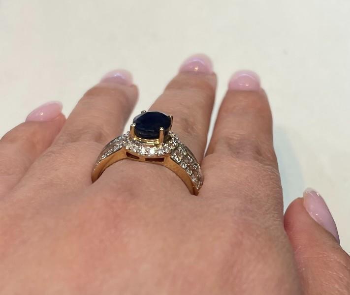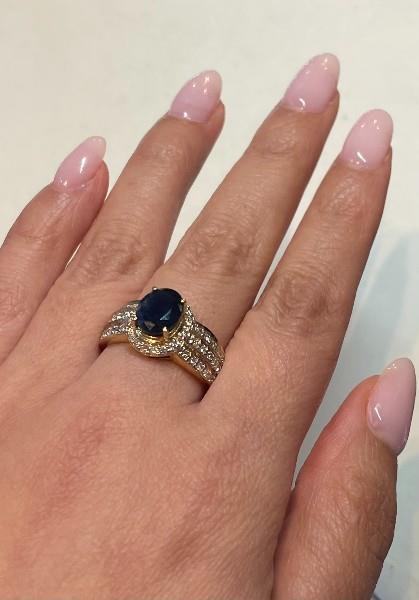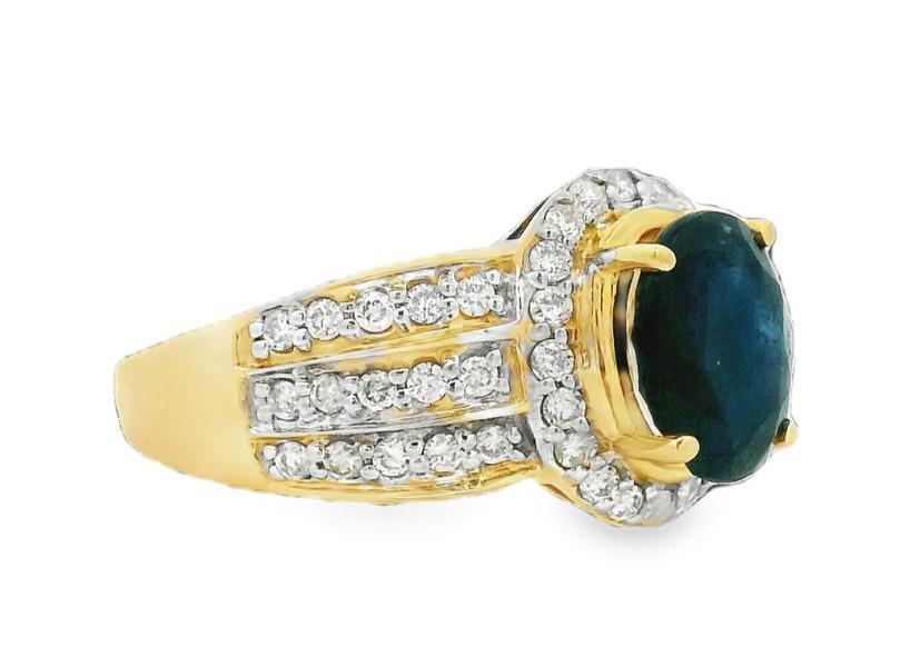 A 14K Y.G OVAL SAPPHIRE OF 2.34CT & DIAMOND TRIPLE CHANNEL SHOULDER RING, A.T.D.W.:.52CT, SIZE: P1/2