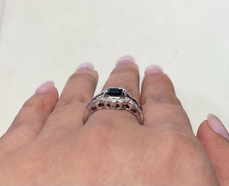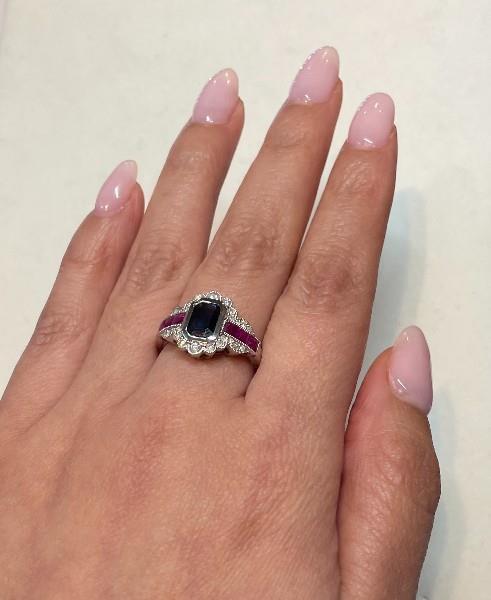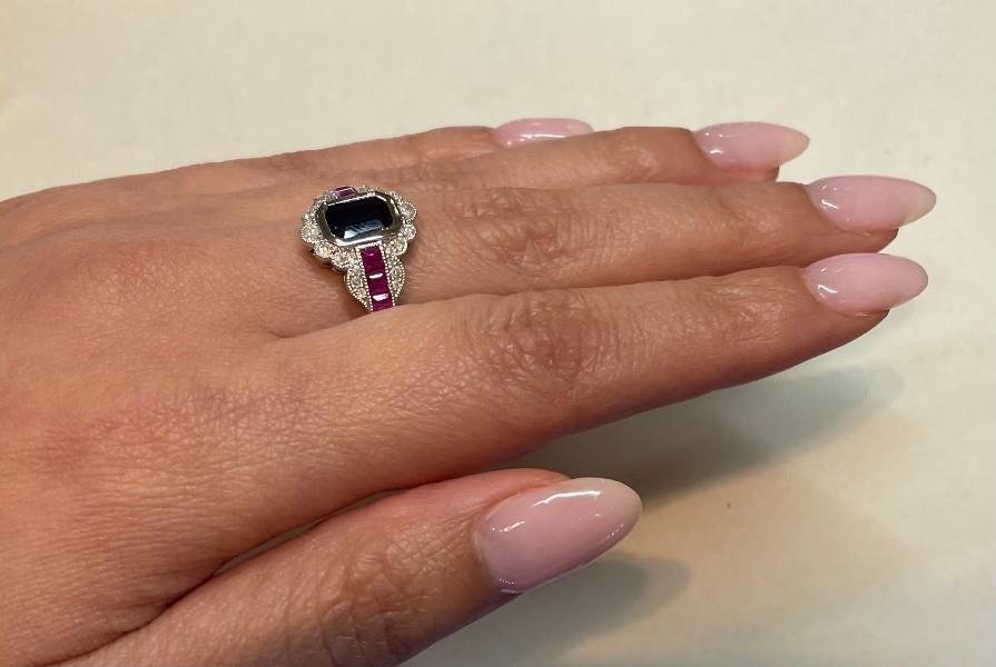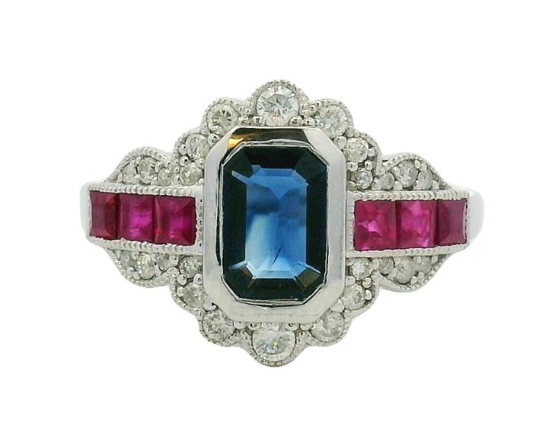 14ct white gold, featuring an emerald cut Sapphire, totalling 1.38ct, deep blue tones, bezel set, centred by two channels, set with six carre cut Rubies, totalling 0.30ct, surrounded by a vintage style frame, set with multi size round brilliant cut Diamonds, totalling 0.25t, millegrain finishes throughout, upswept shoulders, merging into a half round band. Ring size: M Valuation on request. Total weight: 4.7g