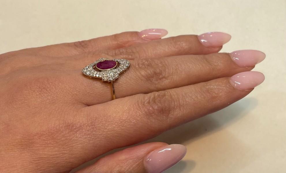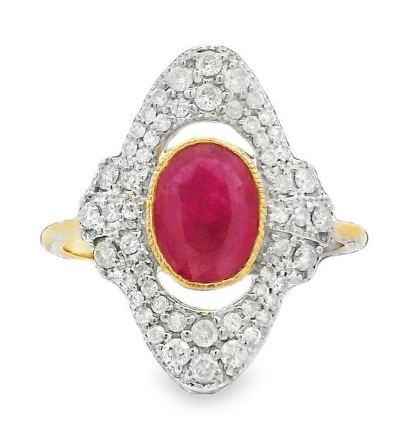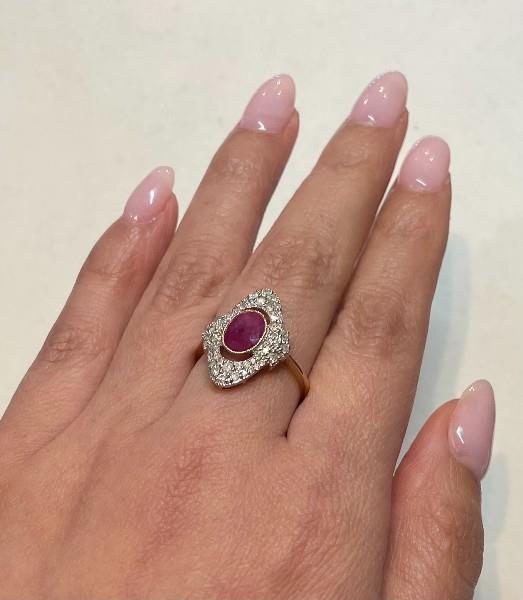 14ct rose and white gold, featuring an oval cut Ruby, totalling 1.36ct, medium purple red tones, bezel with millgrain finishes, surrounded by a floating halo of double lined round brilliant cut Diamonds, extended to the sides, in three rays, different lengths, totalling 0.40ct, multi sizes, bead set, merging into a half round band. Rings size: L1/2. Valuation on request. Total Weight: 2.4g