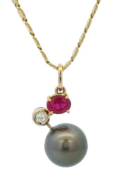 18ct yellow gold to both pendant and chain, Italian and stamped, the modern fixed drop pendant set with a single Tahitian pearl of slightly off round shape, medium grey in colour with faint copper overtones, surmounted by a bezel set brilliant cut diamond and larger oval cut ruby of strong bright colour weighing 1.30ct approximately. fitted with bail and suspended from a fancy bright cut flat link chain with fitted clasp. Pendant Length: 3cm Chain Length: 44cms weighing 9.6grams