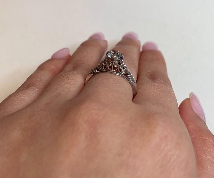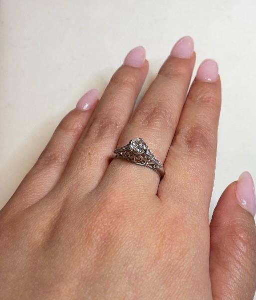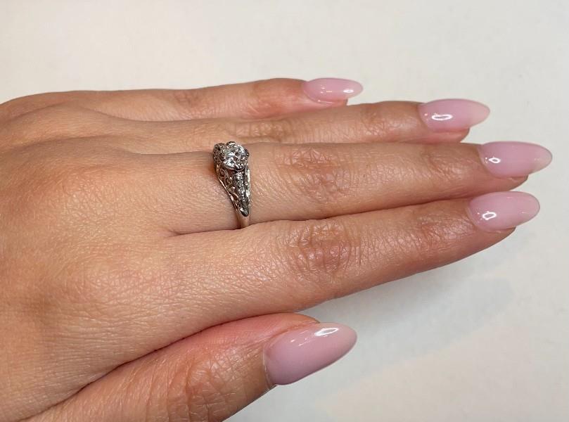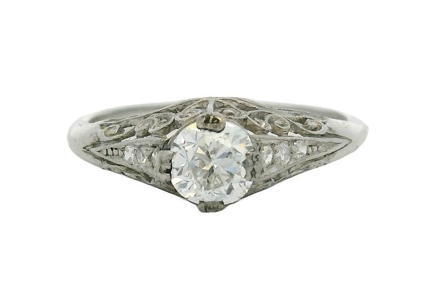 18ct white gold and platinum, stamped, of upswept claw solitaire style, featuring an old cut diamond of approximately 0.52ct, claw set in a filigree worked mount, flanked by tiny diamonds within scrolled framing, merging to reverse. Ring Size M. Total Weight: 1.9grams