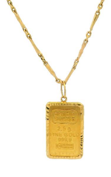A 2.5GRAM 24CT GOLD INGOT IN PENDANT ON HIGH 21CT GOLD CHAIN, WEIGHING 10.2GRAM, CHAIN 44CM LONG