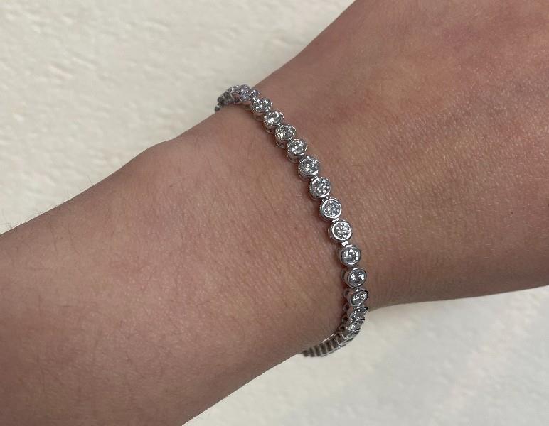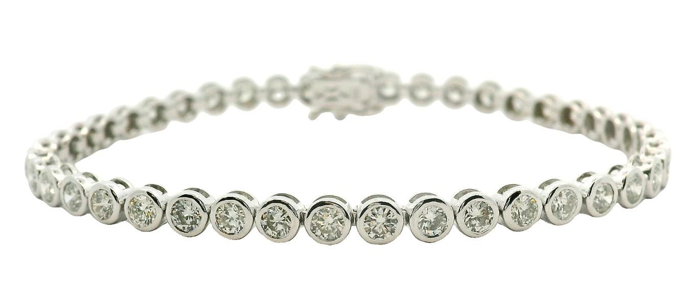 18ct white gold, featuring forty-three round brilliant cut Diamonds, totalling 5.10ct, bezel set, linked through the base in a semi flexible bracelet measuring 18cm long, complete with concealed box clasp, secure with double side latches. Valuation on request. Total weight: 10.3g