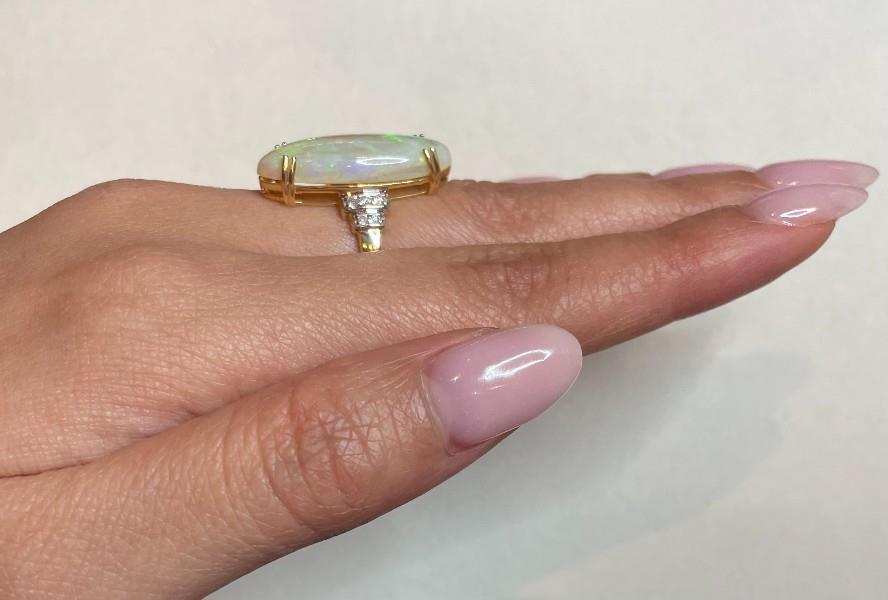 14ct yellow gold, featuring a long oval cabochon Opal, crystal jelly type from Andamooka Australia, totalling 7.77ct, translucent body with play of colours, flashing green, yellow and blue, double claw set, double rails, flanked by tapered steps at the shoulders, lined with round brilliant cut Diamonds, totalling 0.14ct, merging into a square edge band with rounded profile. Ring size: L. Valuation on request. Total weight: 4.1g