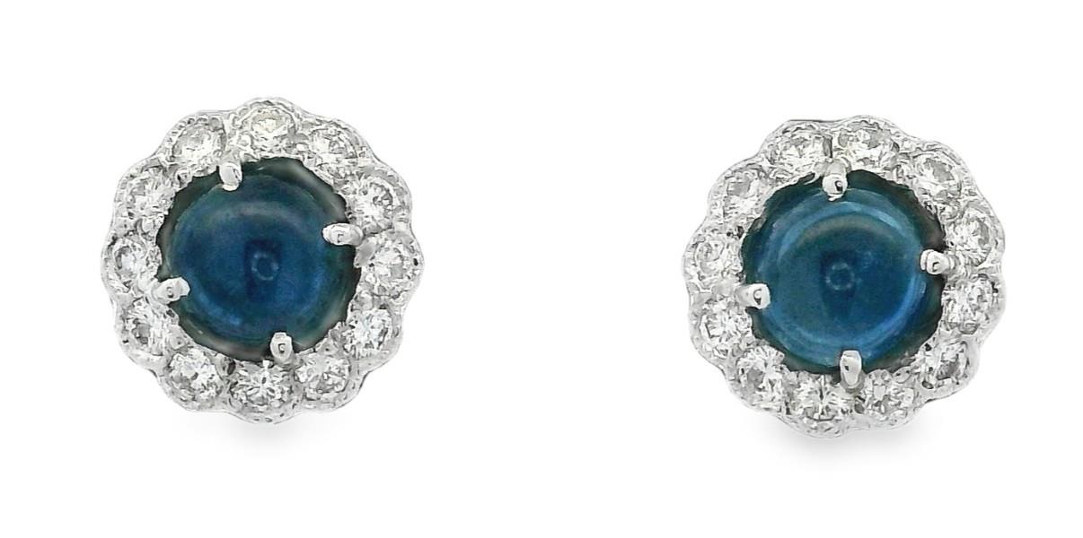 A PAIR OF 18K WHITE GOLD CABOCHON SAPPHIRES (1.81CT) & DIAMOND (.50CT) HALO STUDS, T.W.: 3.4GRAMS