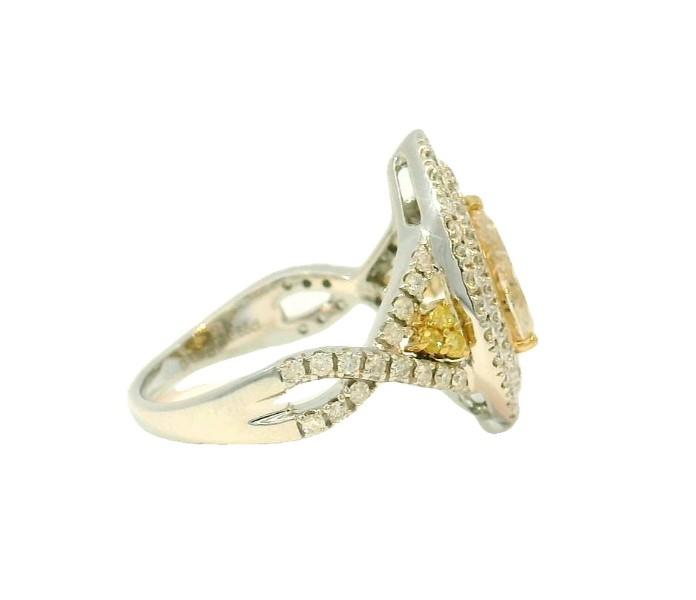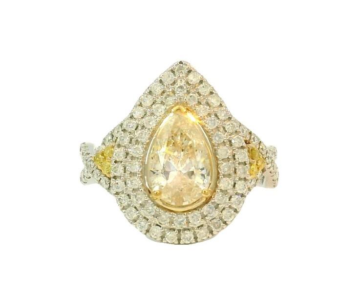 14ct white gold, featuring a centre pear cut Diamond, totalling 1.02ct, fancy yellow, claw set and bezel in yellow gold, surrounded by a floating double Diamond set halo, further flanked by a cluster of six smaller yellow round brilliant cut Diamonds, totalling 0.22ct, Diamond set shoulders on open twist band, merging into a half round band. A.T.D.W.: 1.70ct. Valuation on request. Total Weight: 4.4g