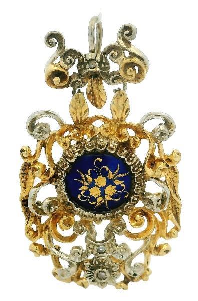 AN 18K YELLOW GOLD ENAMELLED DIAMOND DETAILED GOLD PENDANT/BROOCH, WEIGHING 11.2GRAMS