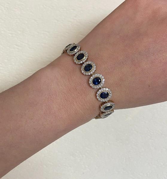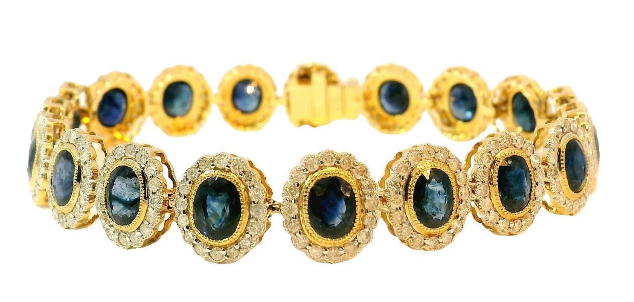 14ct yellow gold, featuring nineteen oval cut Sapphires, totalling 15.97ct, bezel set with millegrain edges, each surrounded by a halo of round brilliant cut Diamonds, totalling 2.91ct, shared bead set and semi bezel with millgrain details, scallop edges, linked through in a semi flexible bracelet measuring 18.4cm, complete with a concealed box clasp, secure with under latch. Valuation on request. Total weight: 16.6g