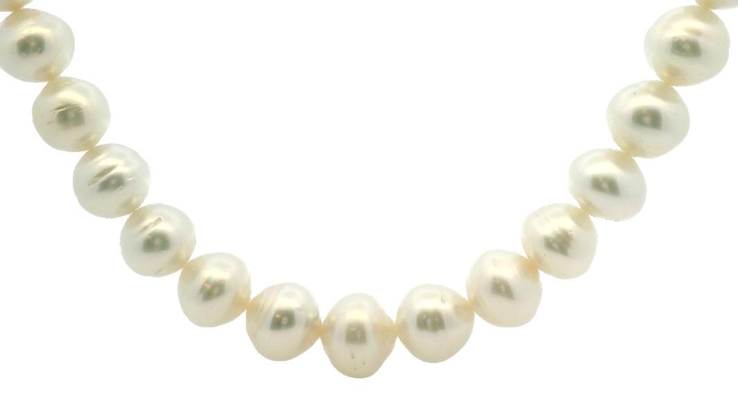 A SEMI BAROQUE STRAND OF WHITE SOUTH SEA PEARLS 12-15MM