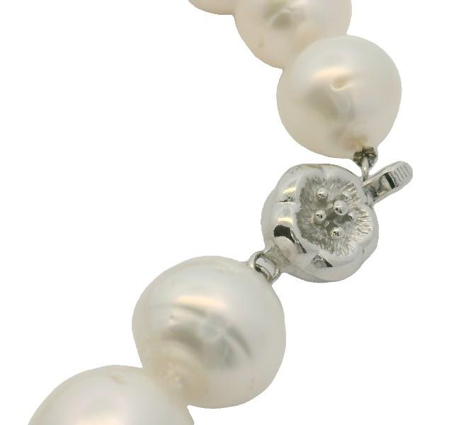 Fitted with 14ct white gold plated floral clasp, the strand presented as thirty-three off round South Sea pearls, each a bright silver white in colour with faint pink overtone and fine lustre, each displaying natural ringing and dimples, the graduated strand ranging in size from 12-15mm, knotted to ends, completed with clasp. Length: 44cms