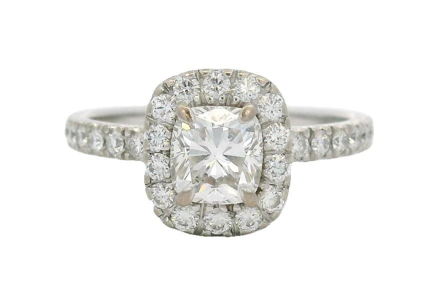 18ct white gold, featuring a cushion cut Diamond of approximate 1.06ct, claw set, surrounded by a cluster of round brilliant cut Diamonds, totalling 0.28ct, claw set, held on a half eternity band made up of 14 round brilliant cut Diamonds, totalling 0.28ct, claw set to band, modern square band at reverse. Ring size: Q. Valuation on request. Total weight: 4.2g