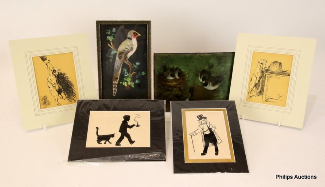Comprising a framed oil bird painting on tile, two Cecil Aldin dog prints, a silhouette boy and cat print and others.