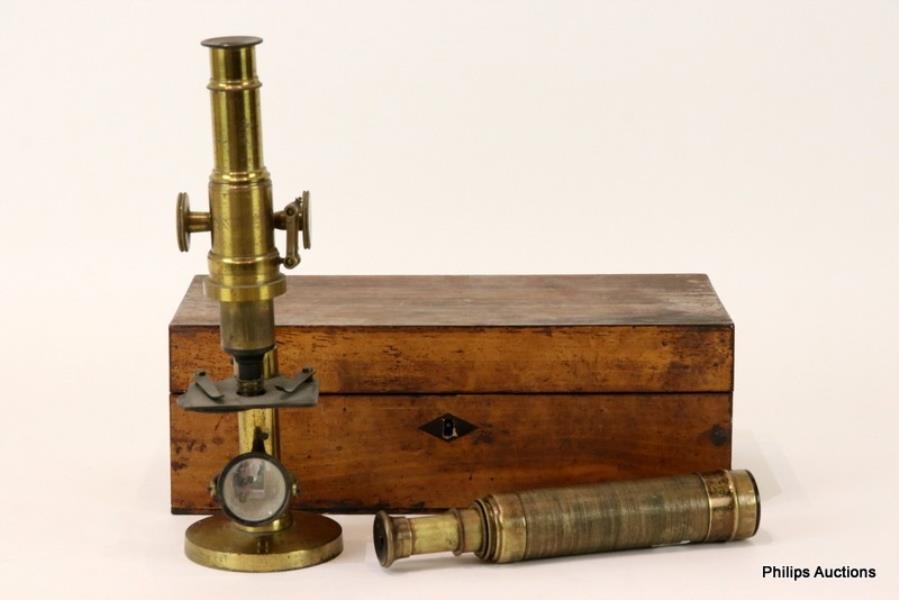 Comprising an early 20th century microscope with a circular base and cylindrical pillar, with spare lens and glass slides, in its original wooden fitted case with key, together with a French brass spyglass, a/f.
