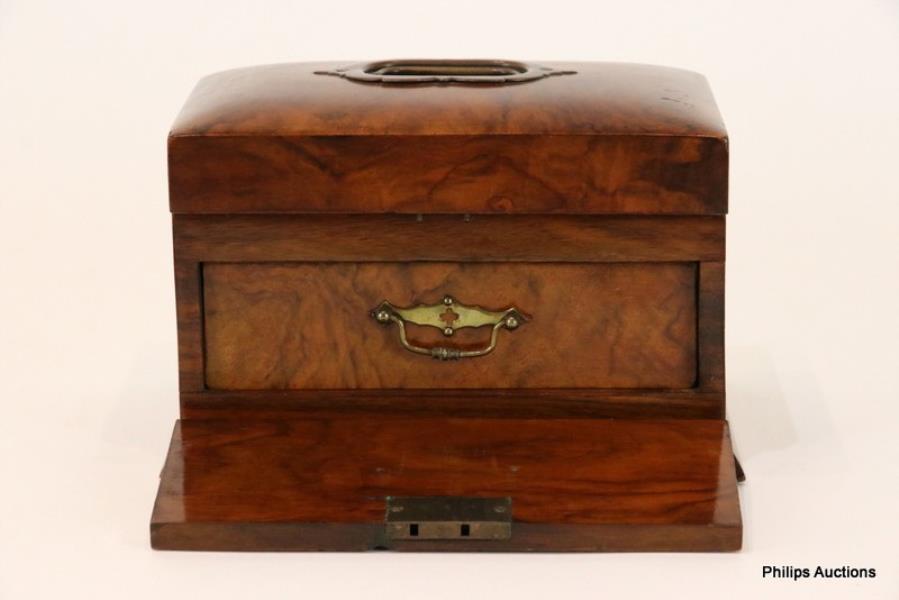 The jewellery box with a slightly dome cover and recessed brass carry handle, opening to a green silk lined interior, with a fall front and lined drawer, the top tray missing.