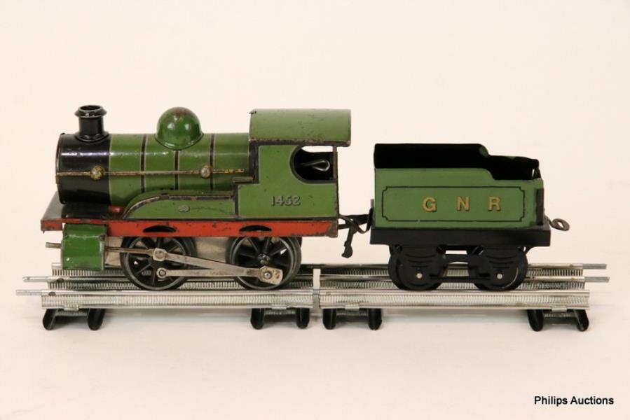 The locomotive with no. 1452 tin printed to sides, the 4-wheel tender with GNR lettering to sides, with rail.