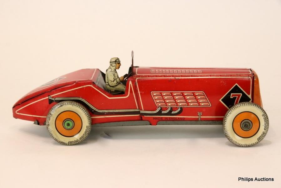The British Mettoy lithographed tinplate boat tailed racing car and driver, probably a Bugatti Type 35, no. '7', finished in red and orange with details including bonnet louvres and straps, filler caps and shock absorbers, with steering and 'Dunlop Fort' balloon tyres, with key.
