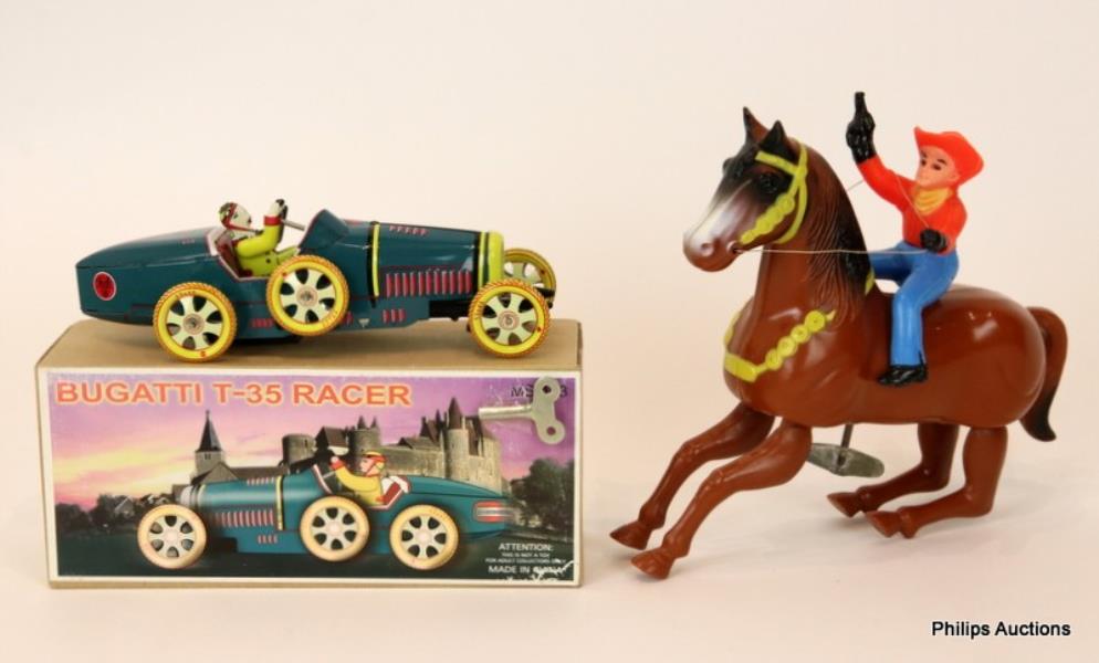 The iconic Bugatti Type 35, in its original box, made in China; together with a vintage plastic cowboy riding a horse windup toy, made in Hong Kong, with key, unboxed.