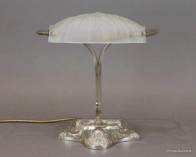 With a nickel plated cast base decorated with foliage and issuing shaped chrome supports to a pivoting moulded glass shade, wired with in-line switch.