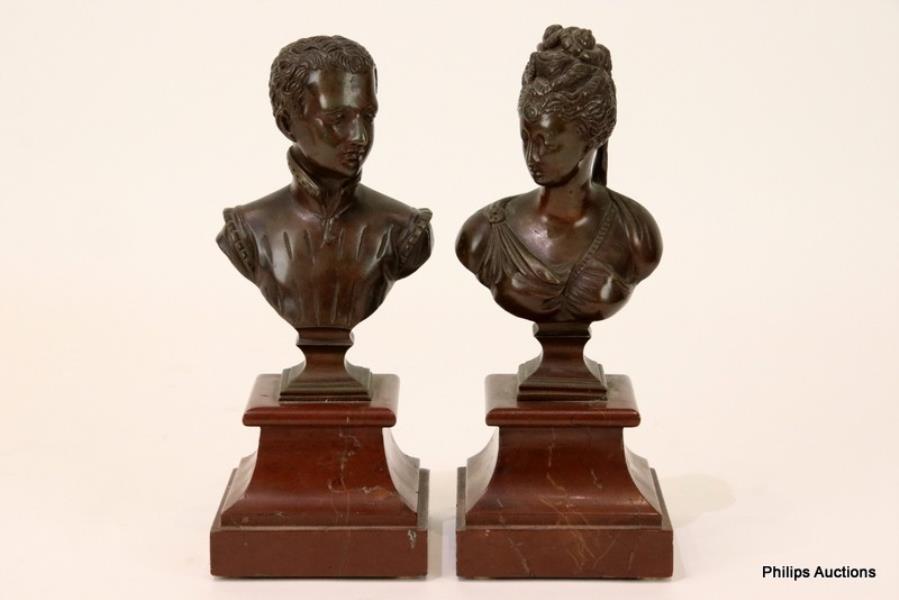 TWO FRENCH BRONZE BUSTS ON MARBLE PEDESTALS