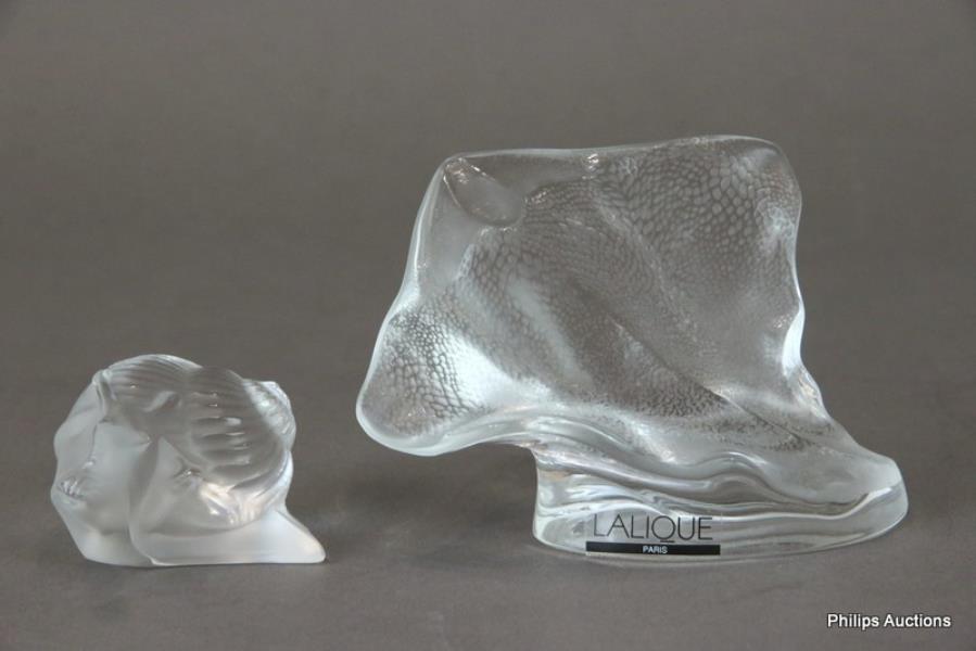 The clear and frosted crystal paperweights, comprising a 'Stingray' with original Label and engraved 'Lalique France' to the underside, together with a snail paperweight, engraved 'Lalique France' underside.