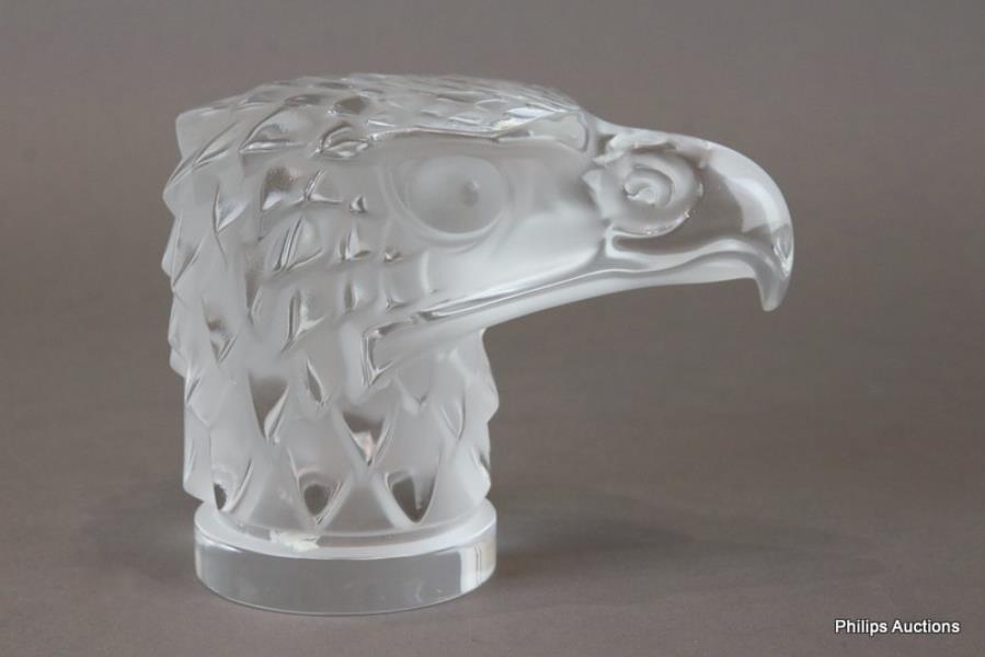 The eagle head in clear and frosted glass upon a clear circular base, engraved 'Lalique France' to the underside, Marcilhac no. 11-808.
