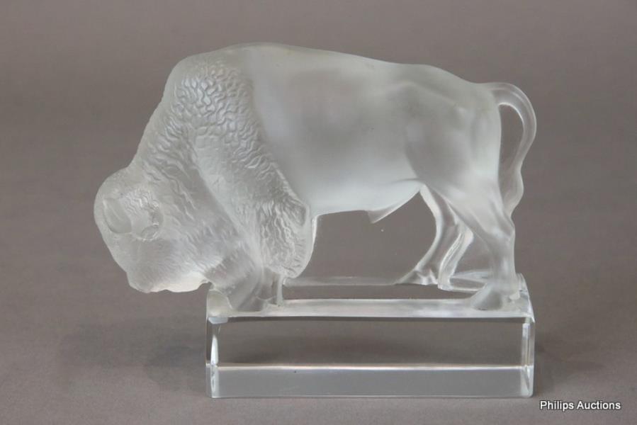 The press-moulded 'bison' (buffalo) in frosted glass, upon a rectangular clear glass base, acid-etched 'Lalique France' to the underside.