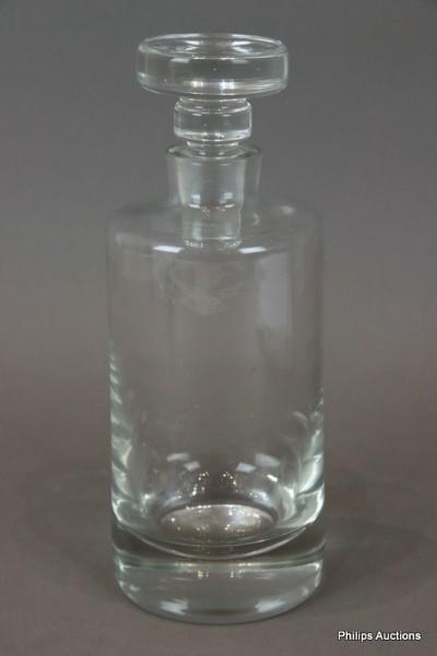 The cylindrical clear glass decanter with a thick base and original stopper, unmarked, in the style of Krosno.