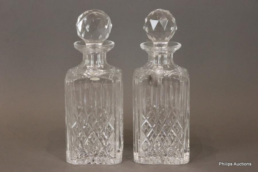 The pair of square form clear crystal decanters with faceted stoppers, canted corners and decorated with linear and diamond design, stencil marked 'Stuart' to the underside, one with original 'Stuart Crystal' label.