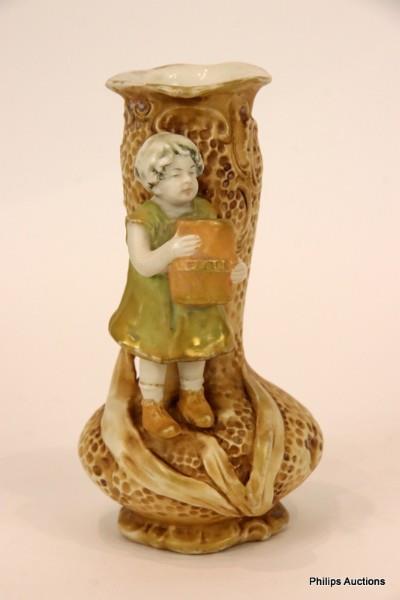 The small vase of organic bulbous form with a young water carrier standing on the side, painted in washed green and brown tones, with Amphora marks and numbers to the underside.