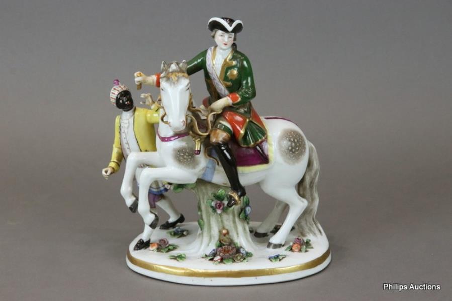 The polychrome group depicting Elizabeth, the Empress of Russia, astride a rearing white stallion, holding a baton in one hand (a/f) and a rein in the other, and wearing the Order of the Polish White Eagle, her turbaned attendant standing by, upon an oval base encrusted with flowers, the underside with underglaze blue mark.