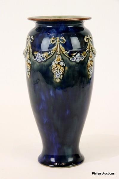 Probably by Christine Abbott, the high shouldered baluster vase decorated with foliate and fruiting drapery swags upon a mottled blue ground, with Doulton roundel, artist monogram and numbered to the underside.