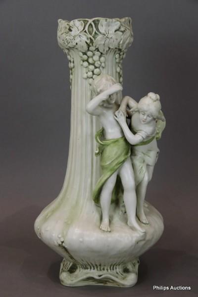 In the Royal Dux Art Nouveau manner, decorated with the figures of a young boy and girl standing on the edge of an elongated gourd-form vase with trailing grapevine in muted green tones, signed indistinctly to the side and with unknown crown above script L impressed mark and numbered to the underside.