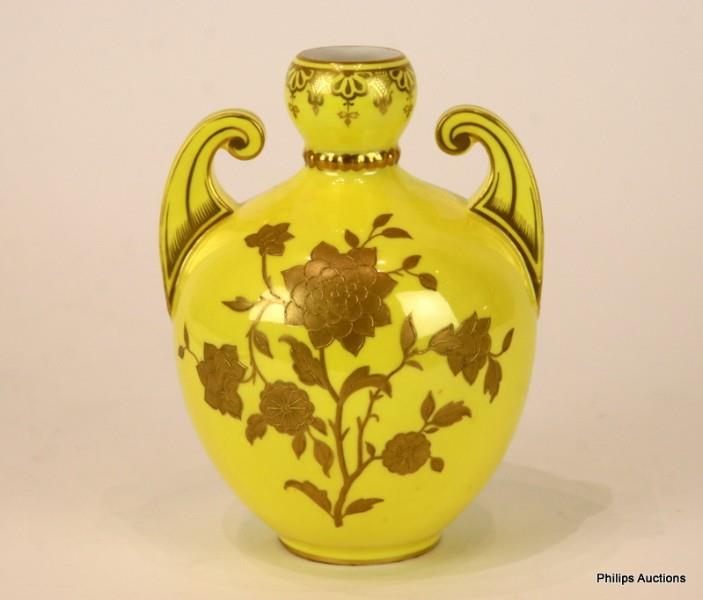 The ovoid ewer form vase with a narrow neck and shaped gilt handle, decorated in the aesthetic manner with shell, floral sprays and insects in raised gilt upon a brilliant canary yellow ground, stamped and with date cypher to the underside.