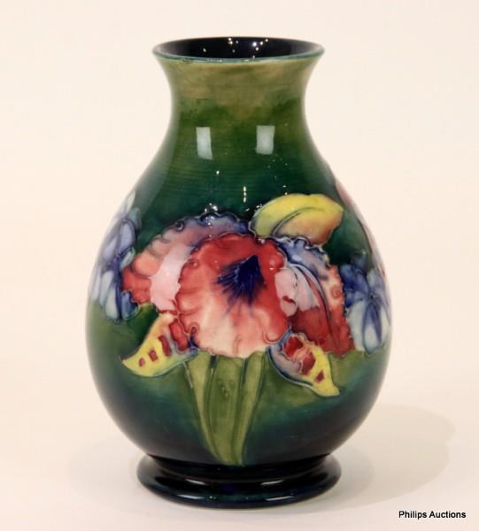 The pear shaped vase with a small foot and a waisted everted neck, tube-lined and decorated with various orchids in lemon, blue, fuchsia and mauve white upon a modulating teal ground; with impressed marks underside, impressed potters to HM the Queen and William Moorcroft initials signature.