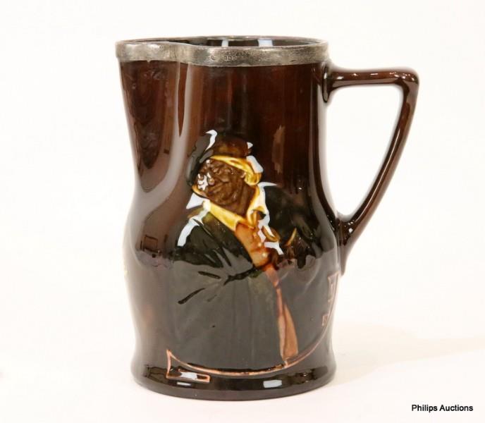 The jug in a deep brown glaze with a bracket handle and hallmarked sterling silver rim, decorated with a merchant and motto 'Would you know the value of money? Try to borrow some', black factory mark to the underside.