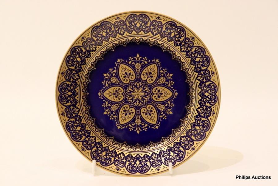The cabinet plate richly gilded with an ornate central rosette of stylised palmettes upon a 'beau bleu' ground, surrounded by a seeded gilt line and a wide band of repeat pattern tight foliate scrolls, with stamped and incised marks to the underside.