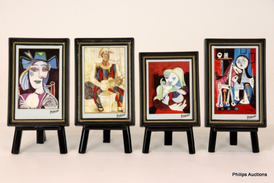 The four Picasso masterpieces, each printed on a small porcelain tile with an integral porcelain frame in black with a beaded gold-tone border, and presented on a wooden stand, including 'Bust of a Woman with a Hat ' (1962) and three others, each with printed Goebel and artist's signature to the reverse, and in their original boxes.