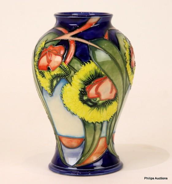 The 65/6 shape vase, made exclusively for Australia, decorated with tube-lined Illyarie gum tree yellow flowers and bright red operculum above a warm orange outback soil, upon a graduated blue ground, with impressed Moorcroft stamp, dated 2000, painted marks and other ciphers to the underside, in its original box.