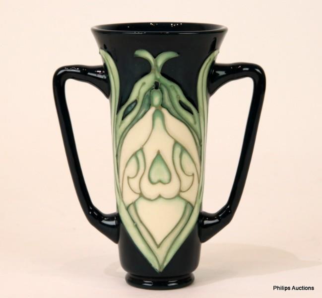 Of tapered form with a flared rim and two angular handles, the 'loving cup' with Rachel Bishop's stylised snowdrops clinging to the cup surrounded by a pale green wash against a dark green ground, with impressed Moorcroft stamp, hand painted M.C.C. initials and other ciphers to the underside, in its original box.