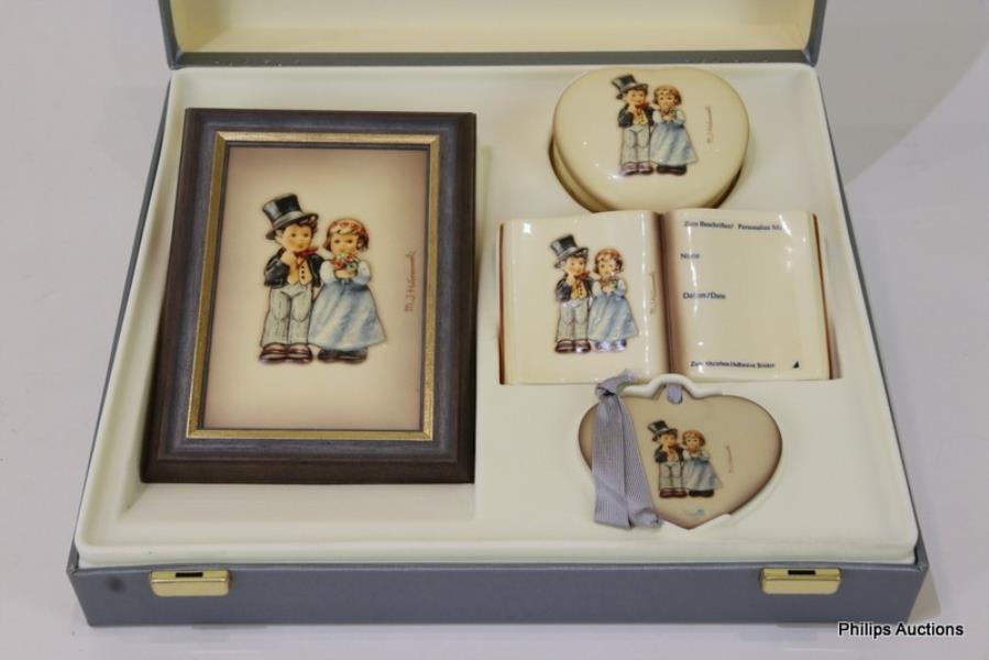 Comprising a no. 2178/A 'Dearly Beloved' relief picture frame, a no. 2152 'Dearly Beloved' heart-shaped box, a no. 2179/A 'Dearly Beloved marriage book plaque' and a heart shaped pendant, all in a fitted Hummel Goebel case.