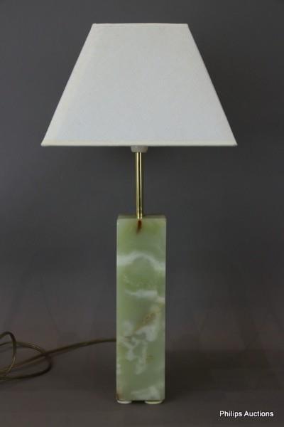 With a square section green figured onyx column, fitted with conical cream fabric shade. Height: 59cm Length: 28cm Width: 28cm