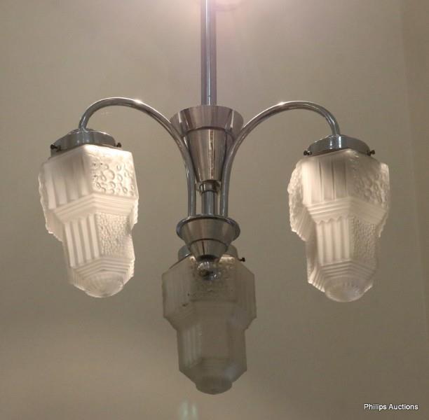 AN ART DECO CHROMED METAL AND FROSTED GLASS CHANDELIER