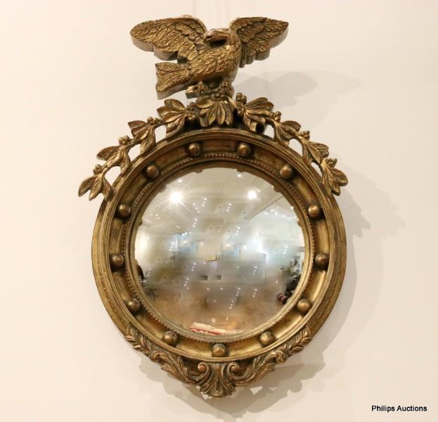 In the antique manner, the convex mirror enclosed by a cast frame with bead motifs surmounted by an eagle with expanded wings.