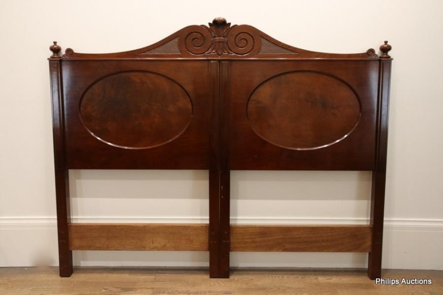 The pair of single bed ends or double bed headboard united by carved crests, without rails.